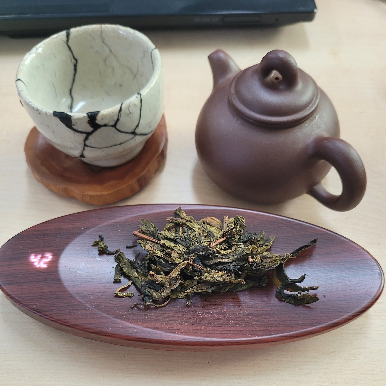 차의 병면은 1200년 수령의 얼가즈 차와 크게 다르지 않다. 그렇지만 일반 야생차보다는 검붉은 색이 덜하고 재배차에 비해서는 검은색이 많다. 이제 얼가즈 차가 과도기 차라는 걸 알 수 있겠다. 다시 만날 수 없는 귀한 차라서 60cc 차호에 4g을 계량해서 넣고 우렸다. 차호의 용량으로 보면 3g만 넣어도 되겠지만 진한 향미에서 차의 본질을 느끼고 싶었다.