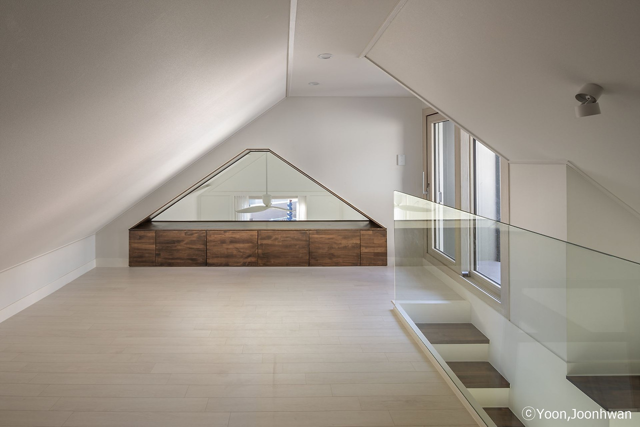 서향 대지인데 남향집이 되었고, 침실 영역과 거실 영역은 나뉘어 채 나눔 개념이 적용되었다. 작은 마당에는 햇살이 담겨 온 집 안에 밝은 기운이 그득하고 밖에서 할 수 있는 일상이 있어 생동감 넘치는 생활이 이루어질 것이다. 거실은 깊은 공간감으로 우리집이 갖는 우월한 자부심이 생기고 넉넉한 다락 공간에서 할 수 있는 일은 얼마나 많을까?